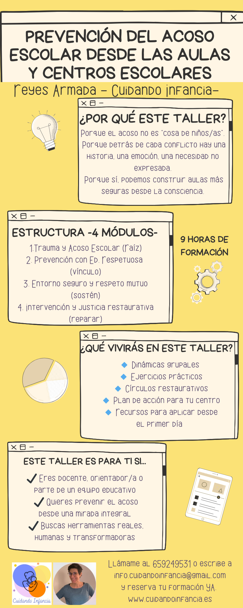 Este taller está diseñado para docentes, orientadores/as y equipos educativos que desean comprender y prevenir el acoso escolar desde una mirada más profunda, respetuosa y transformadora. A lo largo de 4 módulos vivenciales, trabajaremos con herramientas basadas en la neurobiología del trauma, la crianza respetuosa, la teoría polivagal y la justicia restaurativa. El objetivo es crear entornos escolares seguros, donde cada niña y niño se sienta visto, escuchado y protegido.